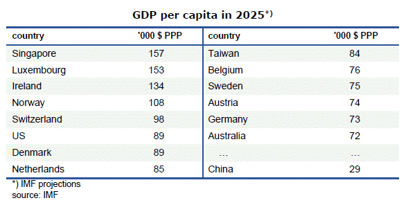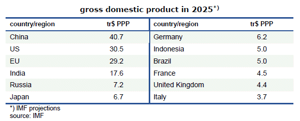 According to IMF-calculations, China’s purchasing power-parity GDP is about 33 percent larger than that of the USA this year. The GDP of the European Union is also significantly larger in PPP terms than in terms of market exchange rates (29.2 instead of 20.0 trillion dollars) – it is suddenly on a par with the United States. If Great Britain were still in the EU, European GDP would be about 10 percent bigger than that of the United States.